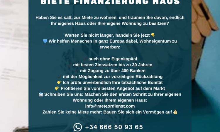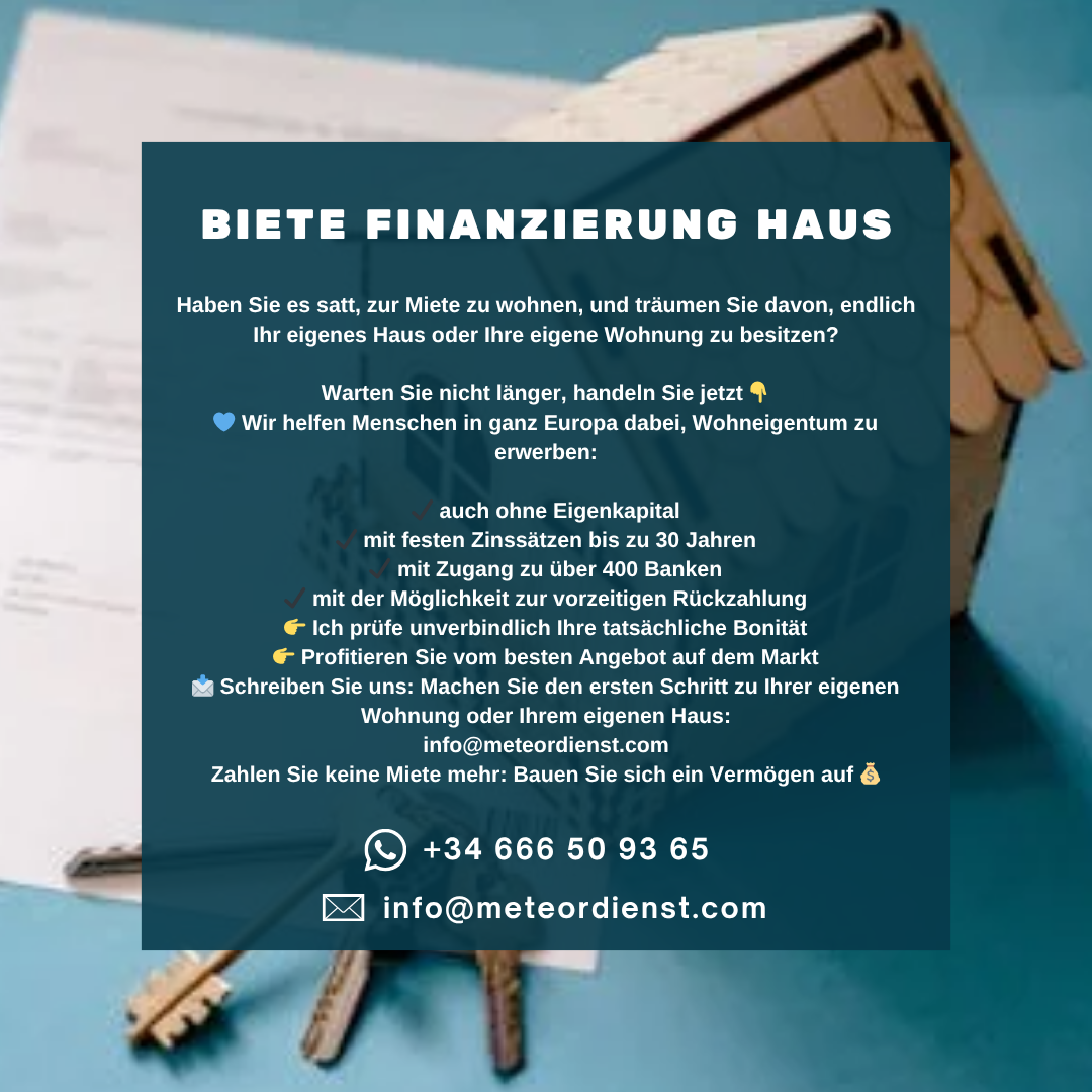 ✔ anche senza capitale proprio✔ con tassi di interesse fissi fino a 30 anni✔ con accesso a oltre 400 banche✔ con la possibilità di rimborso anticipato👉 Verificherò la tua effettiva solvibilità senza impegno👉 Approfitta della migliore offerta sul mercato📩 Scrivici: fai il primo passo verso il tuo appartamento o la tua casa: info@meteordienst.com Non pagare più l’affitto: costruisci un patrimonio 💰